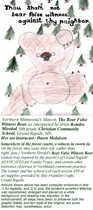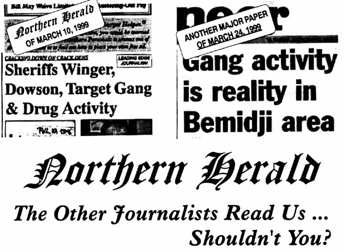 On June 16th, 2003, the United States District Court, at Minneapolis, ordered the City of Bemidji to pay $3,001 in damages, plus costs, for violation of First Amendment rights, by attempting to suppress distribution of Northern Herald in Bemidji. Details in issue of 06/30/03 in The Library, Vol. 8 (link below).